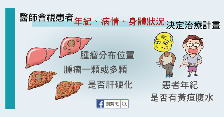 萬一確診是肝癌之後,醫師會先依據患者的年齡、身體狀況(有沒有黃疸、腹水)、以及病情來決定治療方式。腫瘤分布位置不同,是單顆、三顆以內、或多顆腫瘤,或肝功能是否正常都與治療方式有關。