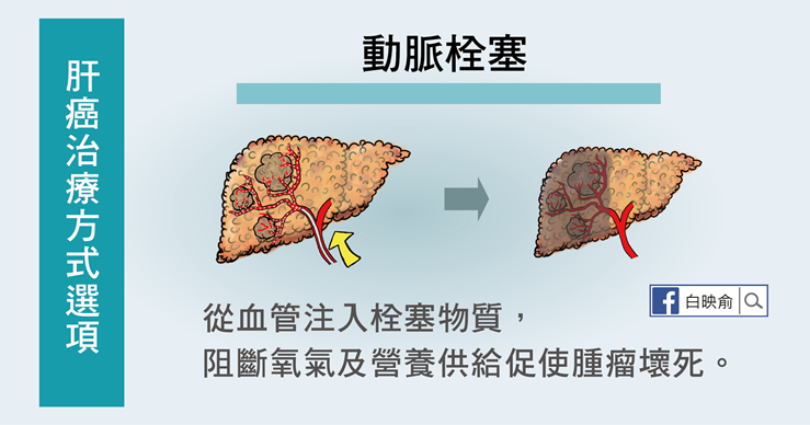 動脈栓塞的原理是,肝動脈會提供腫瘤氧氣及營養,因此從血管注入栓塞物質塞住部分肝動脈後,能促使腫瘤壞死。