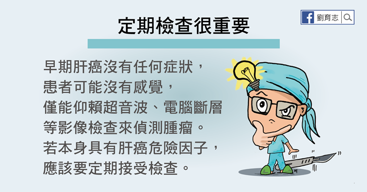 由於早期肝癌沒有症狀,若本身有罹患肝癌的危險因子,例如是病毒性肝炎B肝C肝的帶原者,就應該定期接受超音波或電腦斷層檢查,及早發現腫瘤。
