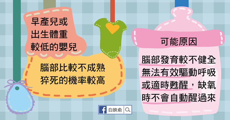 研究發現,早產兒或出生體重較低的嬰兒猝死機率較高。可能是因為這些孩子腦部發育較不成熟,無法有效驅動呼吸或適時甦醒,缺氧後無法自動醒過來。