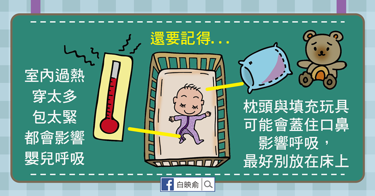 也不要因為怕嬰兒冷到而讓嬰兒穿太多,包太緊,或讓室內非常熱,這些也都會影響嬰兒呼吸。