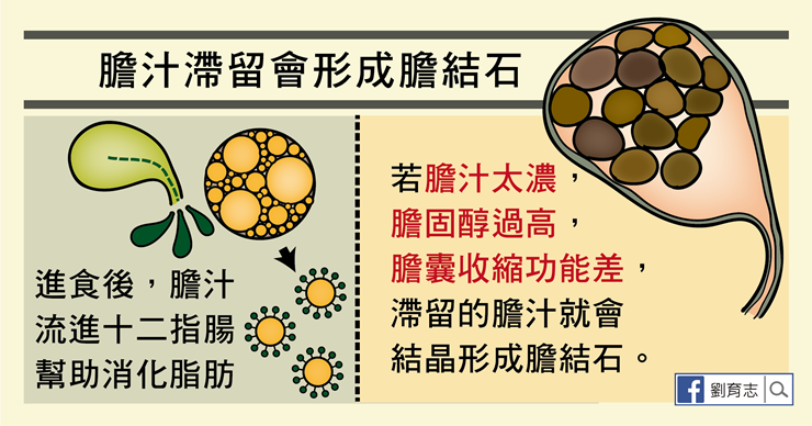 但是,如果膽汁太濃、膽固醇過高、膽囊收縮功能差,膽汁就容易滯留。滯留的膽汁結晶後,就會形成膽結石。