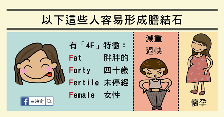 女生較容易形成膽結石,尤其是具有「4F」特色的。