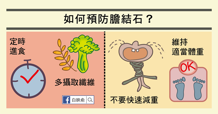 平時如果能夠多攝取膳食纖維,養成定時進食習慣,不要快速減重,並維持適當體重,都能預防膽結石產生。