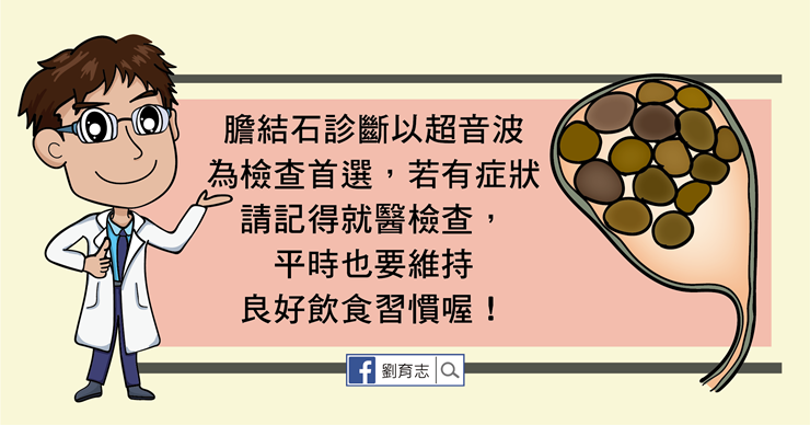 膽結石的診斷以超音波為檢查首選。若有症狀,醫師會先安排超音波檢查,確定是否為膽結石或膽囊炎。記得,平時也要養成良好生活習慣,避免膽結石產生喔。
