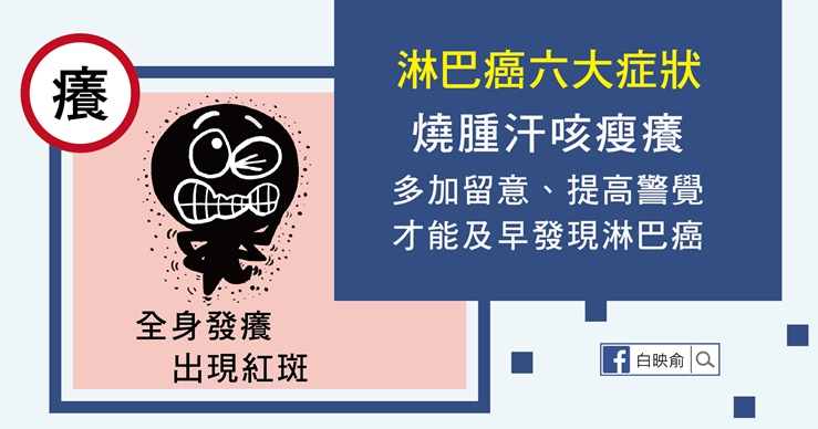 再複習一遍:淋巴癌有六大症狀,燒腫汗咳瘦癢。多留意提高警覺,才能及早發現淋巴癌。