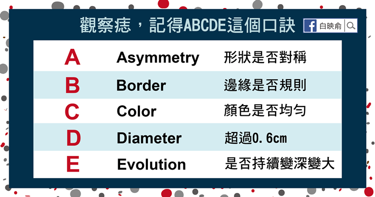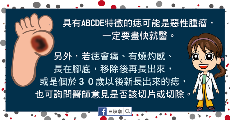 除了ABCDE的特質以外,感覺到痣會痛,有燒灼感,長在腳底,移除後再重新長出來,或是個30歲以後才新長出來的痣,都需要注意,最好可以問問醫師的意見,即決定是否該切片或移除。平時,也要注意防曬!