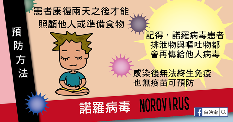 感染諾羅病毒又痊癒之後,並無法終生免疫。也沒有特效藥能夠治療諾羅病毒,也沒有疫苗可以預防。