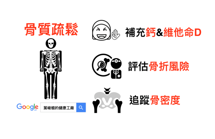 總結:骨質疏鬆並不可怕,可怕的是我們毫無自知 ; 骨折一旦發生,通常已經為時已晚。年齡,跌倒和骨密度是骨折的三大危險因子,尤以脊椎體及髖部骨折最為嚴重!要如何對抗骨質疏鬆?適當的補充鈣跟維他命D,上了年紀就應檢查骨密度並評估骨折風險(尤其是停經後婦女); 若已經有骨質疏鬆,切記要預防跌倒,接受治療並定期追蹤骨質密度。