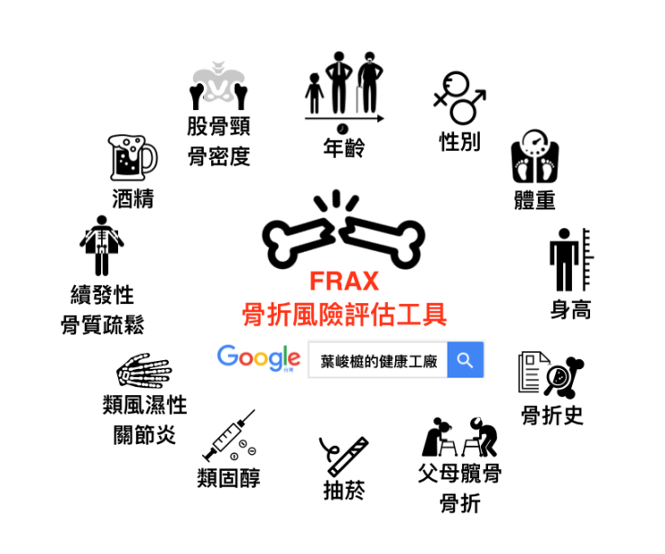 骨折能不能預測?答案是可以的!世界衛生組織骨折風險評估工具(FRAX ®, Fracture Risk Assessment Tool) 就是一個很實用的工具。FRAX ® 使用了年齡(此評估表主要是針對40到90歲的未曾接受治療族群,故年齡若小於40歲,則以40歲來計算,如大於90歲僅以90歲計算)、性別、體重(公斤)、身高(公分)、過去骨折史、父母髖骨骨折、吸菸、類固醇、類風濕性關節炎、續發性骨質疏鬆、每日飲用酒精3單位或以上、股骨頸骨密度(BMD)等共12項危險因子來推估未來十年的骨質疏鬆機率。
