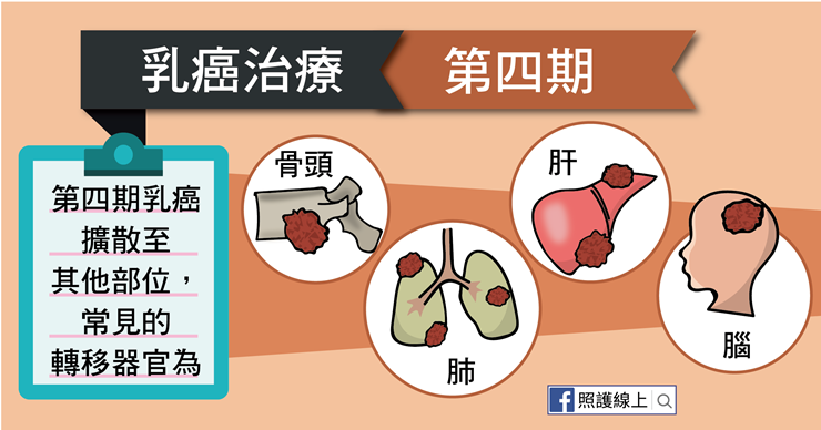 當乳癌細胞已經擴散到其他部位,轉移至像是肝臟、肺臟、骨頭、或腦部時,就稱為第四期乳癌。