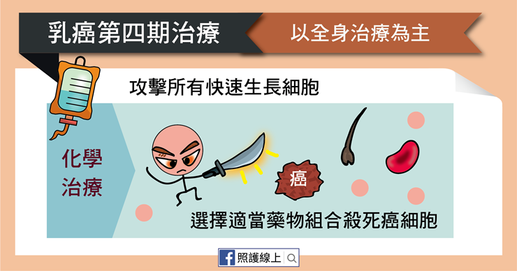 第四期的乳癌治療需要以全身治療為主,第一個可以考慮化學治療,化學治療能夠殺死所有快速生長的細胞,因此除了癌細胞外,毛髮、血球、或腸胃道黏膜也會受到藥物影響。
