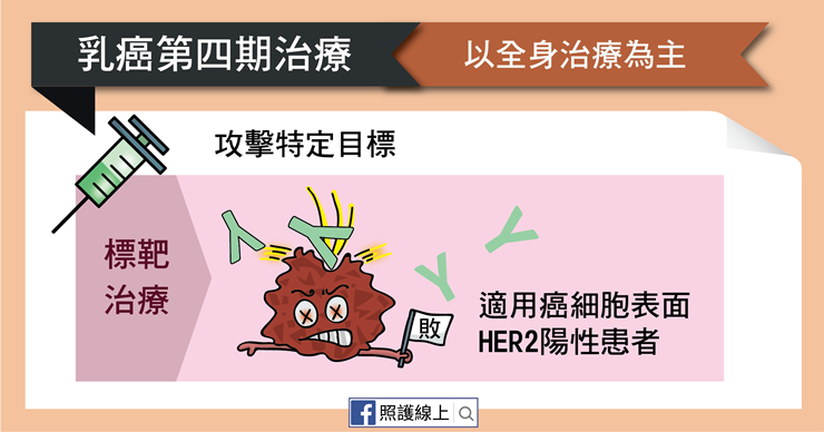 假使患者檢體的癌細胞表面HER陽性的話,也可以考慮標靶治療。標靶治療能攻擊特定細胞,針對乳癌細胞攻擊。