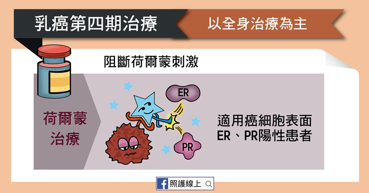 假使檢體發現癌細胞表面有ER、PR陽性的狀況,要搭配賀爾蒙治療,阻斷荷爾蒙對癌細胞的刺激。