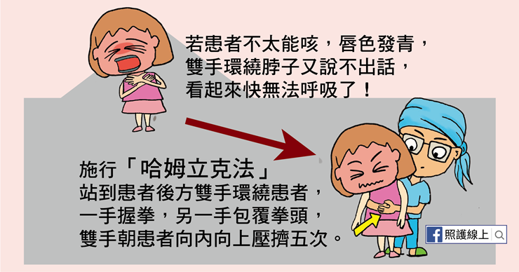 若你發現患者無法說話、快無法呼吸、也沒辦法用力咳嗽、嘴唇及臉色發青,就趕快施行哈姆立克法。