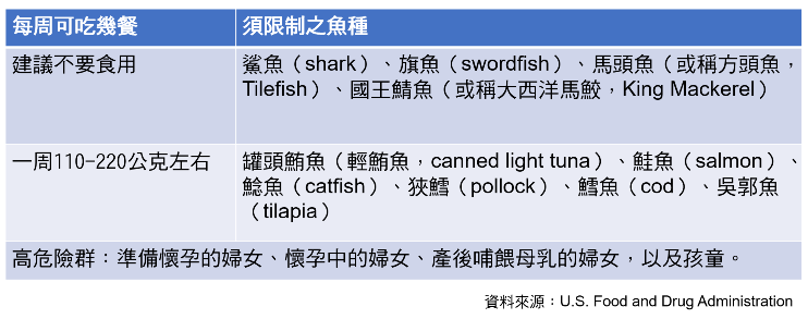 由於汞對於發育中的腦部,傷害最明顯,因此這些建議的對象是表中所列的高危險群。