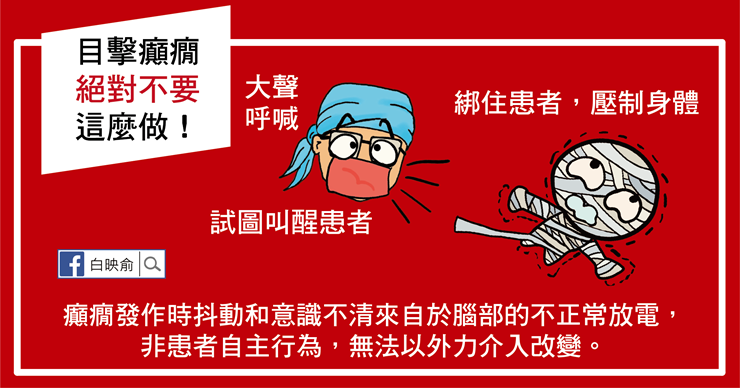 不用大聲呼喊試圖叫醒患者,更不要綁住患者身體想要限制他不再亂動。因為這些意識不清及抖動都是來自於腦部不正常放電,不是患者能決定的,用外力限制也無法改變。