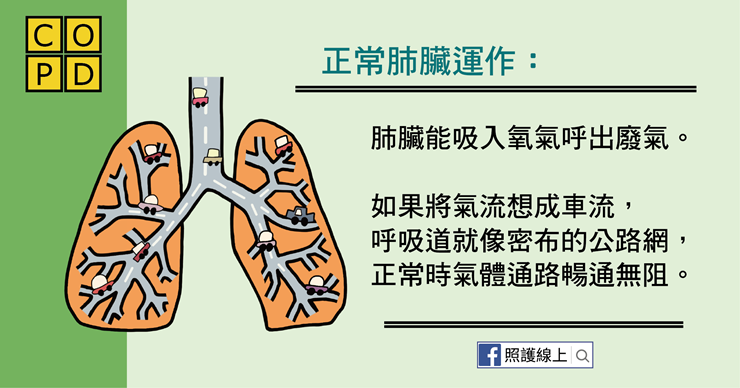 肺臟能夠吸入氧氣並呼出廢氣。如果將氣流想成車流,呼吸道就像密布的公路網,正常時候這些氣體通路暢通無阻。