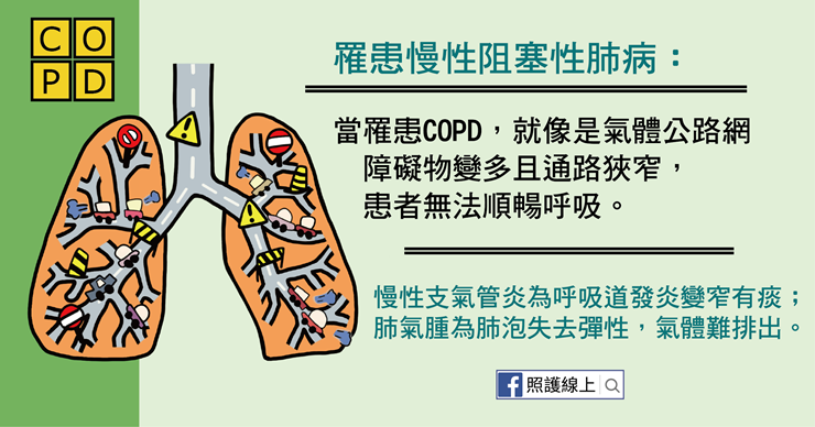 慢性支氣管炎為呼吸道發炎變窄並產生痰液;肺氣腫則代表肺泡失去彈性,氣體滯留在肺泡內無法排出。