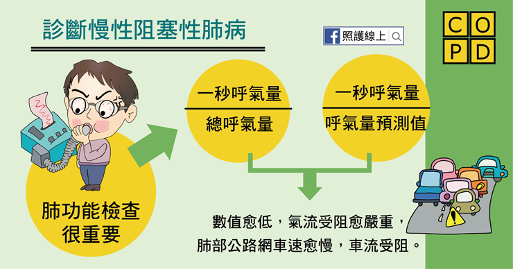 當(一秒呼氣量/總呼氣量)與(一秒呼氣量/呼氣量預測值)兩個數值愈低,代表氣流受阻愈嚴重,也就是肺部公路網車速愈慢,車流受阻。