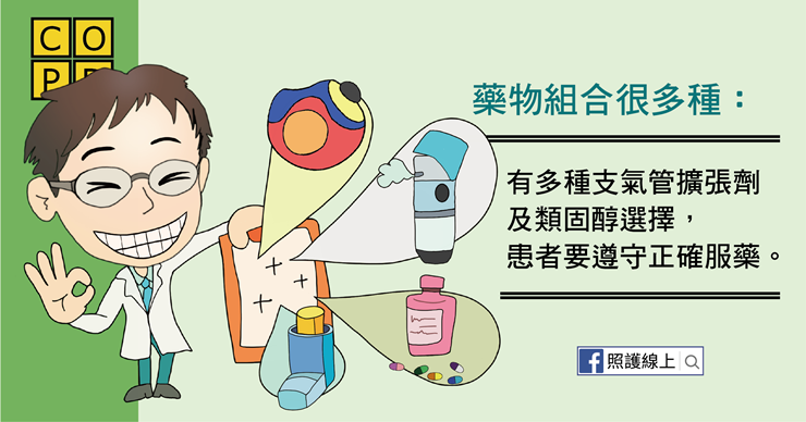 因為目前有多種支氣管擴張劑及類固醇的藥物選擇,有的是吸入性,有的為口服;有的屬長效藥物,有的則為短效;有些能長期服用,有些僅限短期治療,都不盡相同。醫師會依照患者的肺功能及症狀選擇不同藥物組合,患者要遵守正確服藥。