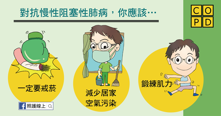 首先,面對COPD的第一任務就是戒菸!若有困難,可尋求醫師專業協助。同時也要避免吸入二手菸。(成功戒菸有方法,讓醫師來幫助你)