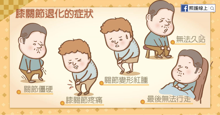 退化性關節炎的症狀是漸進性的,剛開始會關節僵硬、疼痛,接著紅腫變形,無法久站,最後可能無法行走。