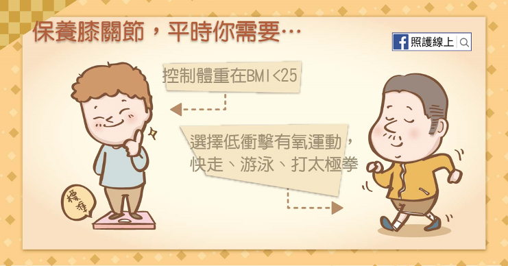 運動時選擇低衝擊有氧運動,對關節的負荷及衝擊比較小,像是快走、游泳、打太極拳都可以。