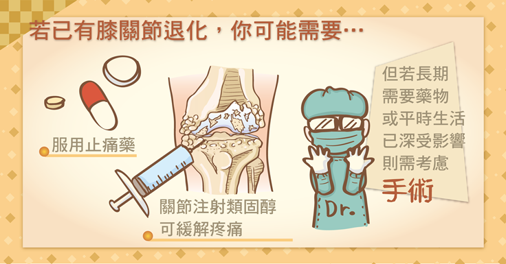 如果發現長期需要吃止痛藥,且退化性關節炎已經嚴重影響生活品質,就要考慮是否接受手術。
