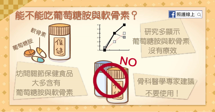 坊間雖然常常販售葡萄糖胺和軟骨素當成保養關節的保健食品,但研究多顯示沒有療效,身體機能還可能因為保健食品的添加物受害,骨科醫學專家建議不要使用!