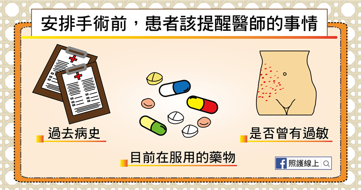 當醫病雙方都同意手術後,患者也要記得提醒醫師自己過去的病史,有沒有藥物或食物過敏的經歷,以及列出目前正在服用的藥物清單,讓醫師更了解自己的狀況。這些都能夠讓保障手術安全喔!