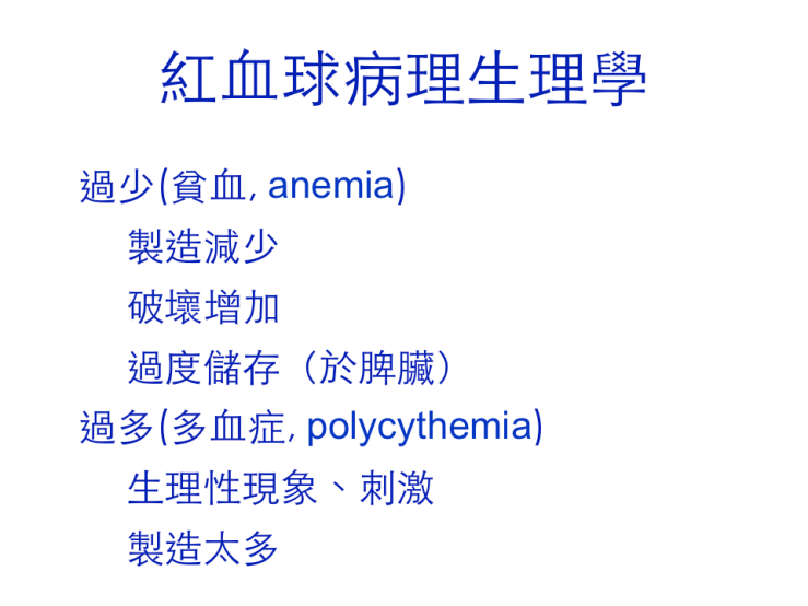 b. 骨髓內製造紅血球細胞減少:如再生不良性貧血,血癌等。好比血液細胞製造的工廠(骨髓) 被流氓霸佔了,工廠當然製造不出產品。