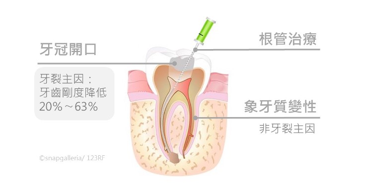 經過根管治療或牙髓處置後的牙齒,其牙本質的本身結構(膠原纖維、水份含量…等),改變不大。不至於像我們聽說的抽完神經的牙齒變的比較脆,亦不會是造成牙齒脆裂的主因。