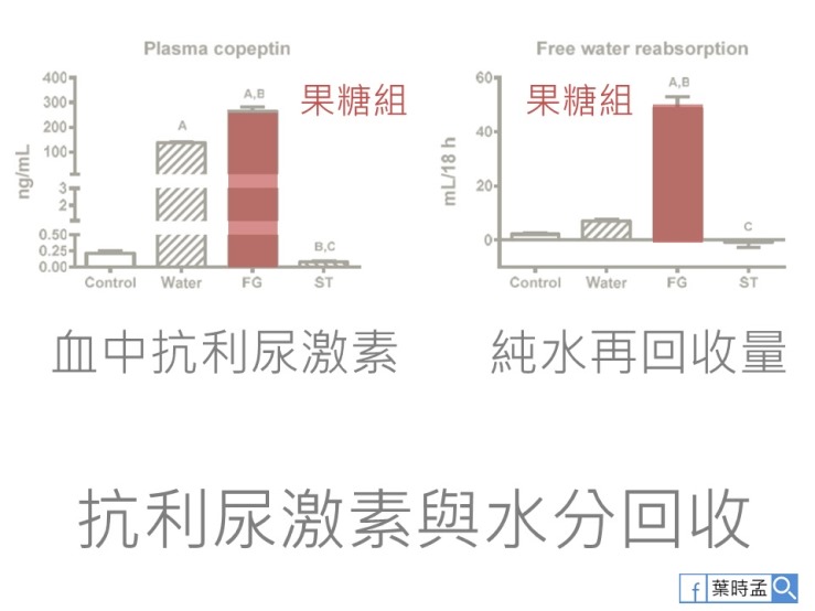 這表示果糖組的老鼠無法有效的將脫水導致的血液濃縮、高滲透壓降低,腎臟需回收大量水分來降低血中滲透壓。