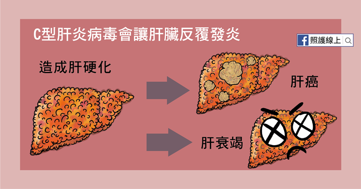 有時候患者會到感染C型肝炎已經許多年後,才突然發現自己已經肝硬化了!原來,C型肝炎病毒會反覆地攻擊肝臟,肝臟在不斷發炎與修復的過程中,就會肝硬化,甚至也可能演變成肝癌及肝衰竭的狀況。
