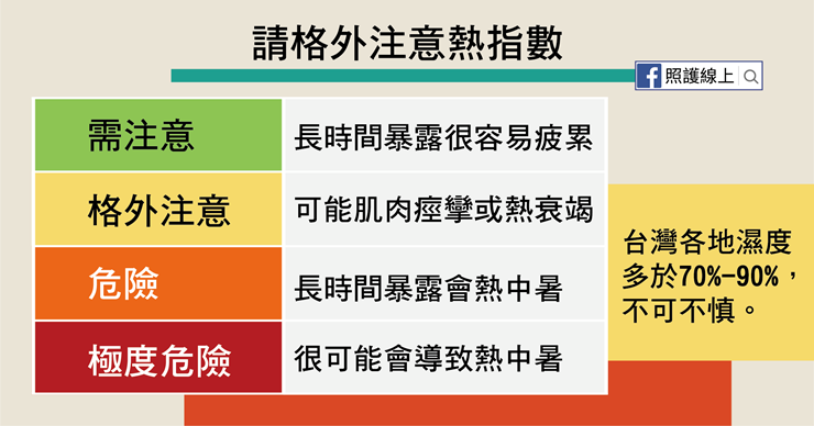 上一張熱指數的表格,有綠色、黃色、橘色、紅色等不同背景色,代表的就是熱指數的危險程度。