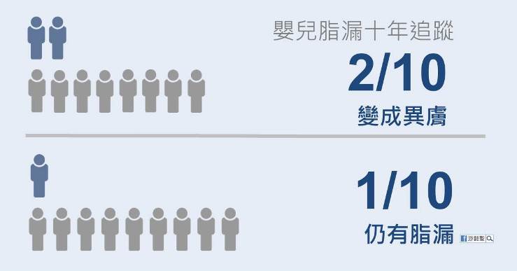 總體來說,嬰兒有脂漏,之後變成異位性皮膚炎的比例,大約百分之二十;嬰兒有脂漏,之後仍持續有脂漏性皮膚炎的比例,大約百分之七。