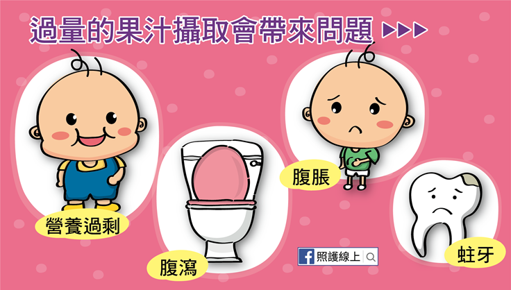 對一歲以上的孩童而言,果汁的營養益處並不會比直接吃水果來得高。過量的果汁攝取會造成營養過剩或營養不良,同時也會帶來腹瀉、腹脹、及蛀牙等問題。