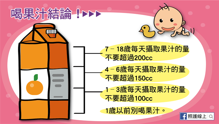 一歲到三歲每天攝取果汁的量不要超過100cc,約是一瓶養樂多的量(原文為4盎司,約118毫升,這裡提供較方便家長記憶的量)。