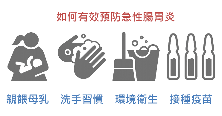 接種輪狀病毒疫苗-在嚴重的急性腸胃炎中,輪狀病毒感染是最常見的原因,根據統計,輪狀病毒每年約造成全世界 40~50 萬個五歲以下的幼童死亡。口服輪狀病毒疫苗可以有效保護嬰幼兒免於感染,目前在台灣仍為自費疫苗,但在台北市、新竹縣竹北市有提供部分補助。