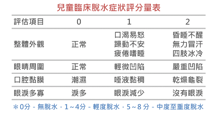 我在這邊提供一個「兒童臨床脫水症狀評分量表」,讓爸爸媽媽們有一個評估的依據,而除了表中的症狀以外,還有如體重減輕、尿量減少、前囟門凹陷、呼吸急促、心跳過快等情形,也代表小朋友正處於脫水的狀態,輕度的可以先給他們補充水分,中度至重度的就需要帶去看醫生了。