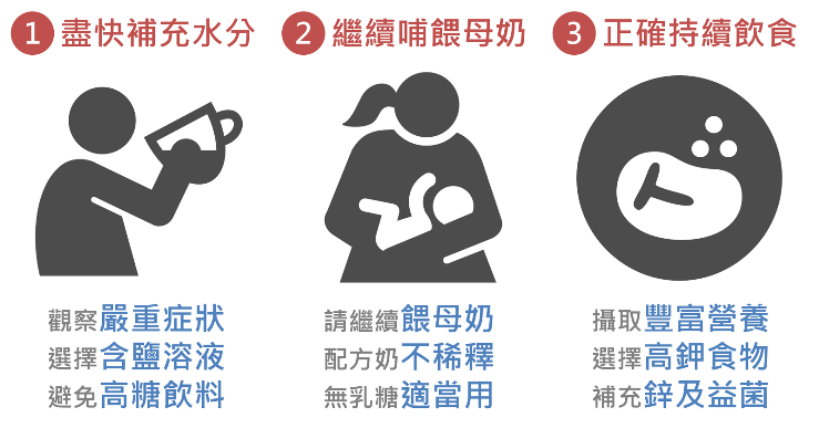 電解質補充液中的糖分、電解質、滲透壓,都被設計為最適合人體吸收的比例,可以快速補充水分。有太多的研究證據顯示,電解質補充液能有效改善脫水,減輕嘔吐與腹瀉,降低需要打點滴與住院的機率。至於白開水或含糖飲料(如運動飲料),都是不好的選擇,大量飲用會加重腹瀉的症狀,導致嚴重的電解質不平衡。