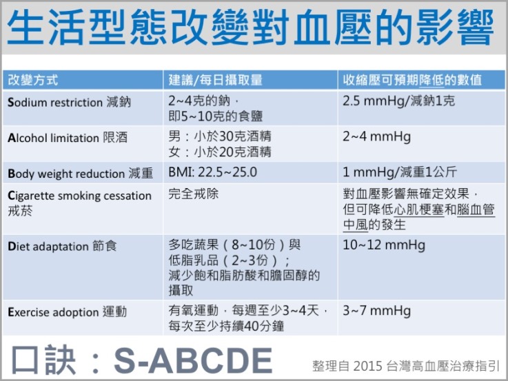 所幸,透過生活型態的調整,可有效降低收縮壓,有一個方便記憶的口訣「S-ABCDE」:Salt減鹽,Alcohol少喝酒,Body weight reduction減重,Cigarette smoking戒菸,Diet飲食(多吃蔬果,減少飽和脂肪酸的攝取),Exercise 多運動;根據實證醫學的相關研究文獻指出,這些健康的生活習慣,確實能有效降低收縮壓數值(詳情請參照下表)。