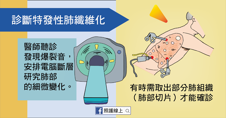 假使醫師聽診聽到爆裂音,懐疑患者罹患肺纖維化,會安排電腦斷層檢査肺部的細微變化。