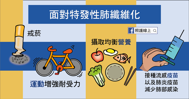 ● 肺部復健:透過運動增強耐受力,學習呼吸技巧讓肺部運作更有效率,也要攝取均衡營養。