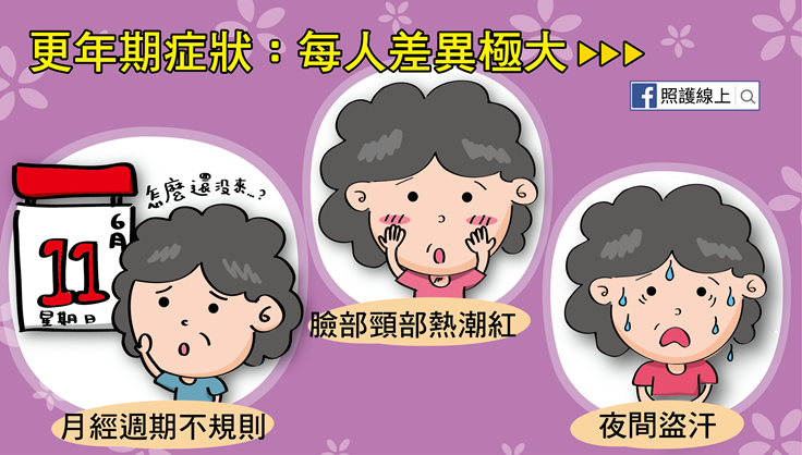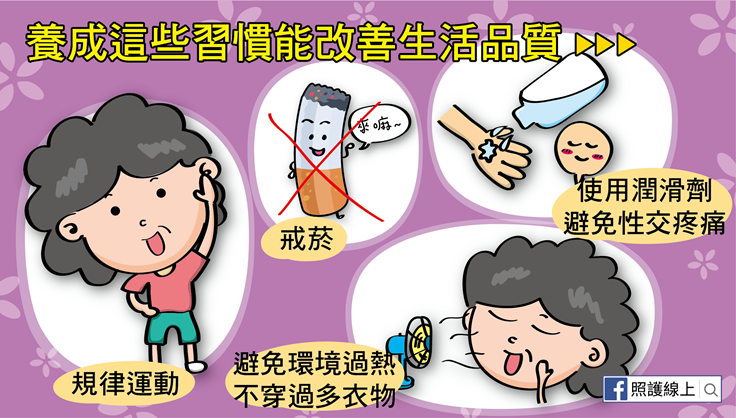 ● 熱潮紅嚴重時,可以減少喝熱飲、吃辣味食物、穿太多、或房間過熱。
