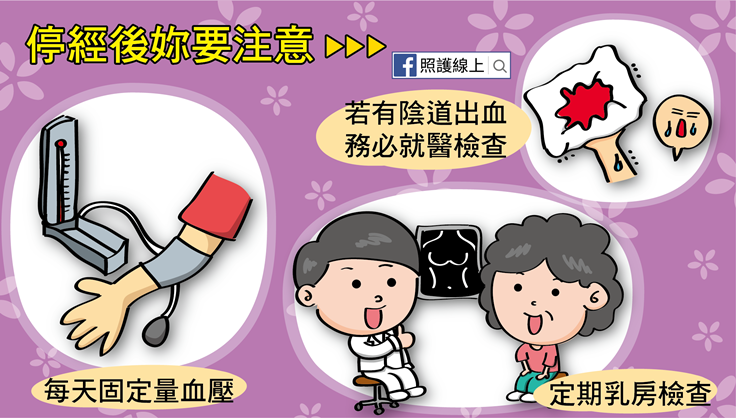 進入更年期,你需要更為你的健康多花點心力。每天可以養成量血壓、血糖的習慣,並每年記得接受乳房檢查。另外,請務必記得,停經後若有陰道出血,一定要到婦產科就診。