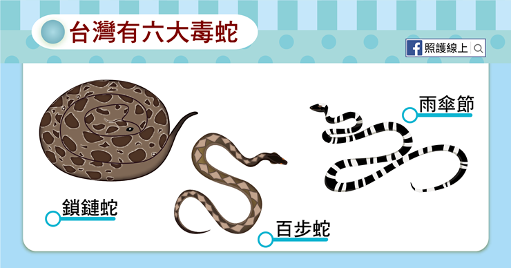 台灣主要有六大毒蛇,萬一不幸被咬到的話,最重要的是趕快就醫,接受「蛇毒血清」注射,以對抗毒素。