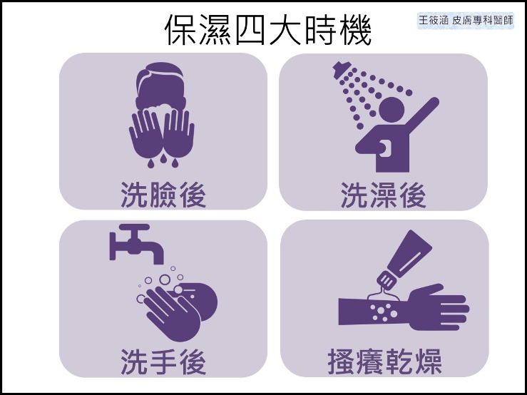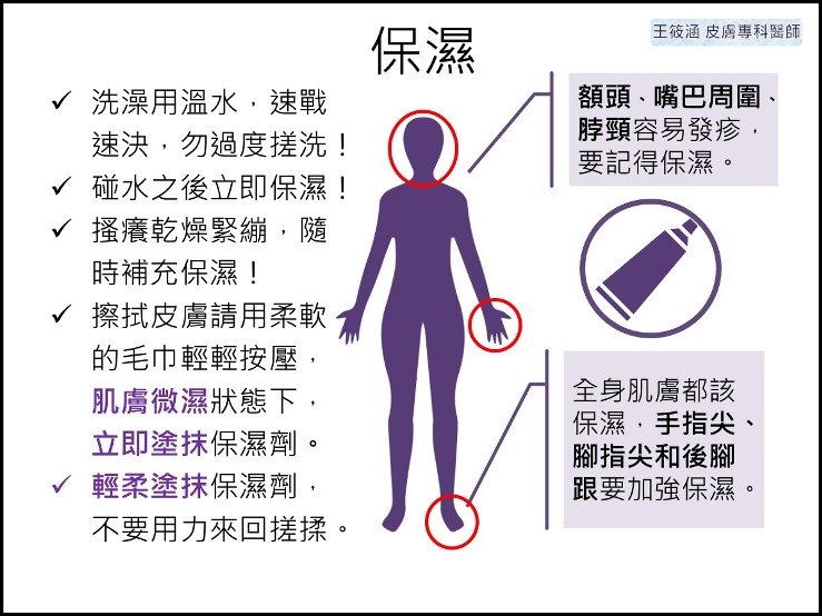 洗澡後身體還帶有些許水分,是塗抹保濕劑的最佳時段,局部使用凡士林或醫療級皮膚保濕產品,可以在皮膚表層形成油膜屏障,減少水分從皮膚表面蒸發。有病灶的區域,先擦藥,再將保濕劑塗抹在所有的皮膚上。