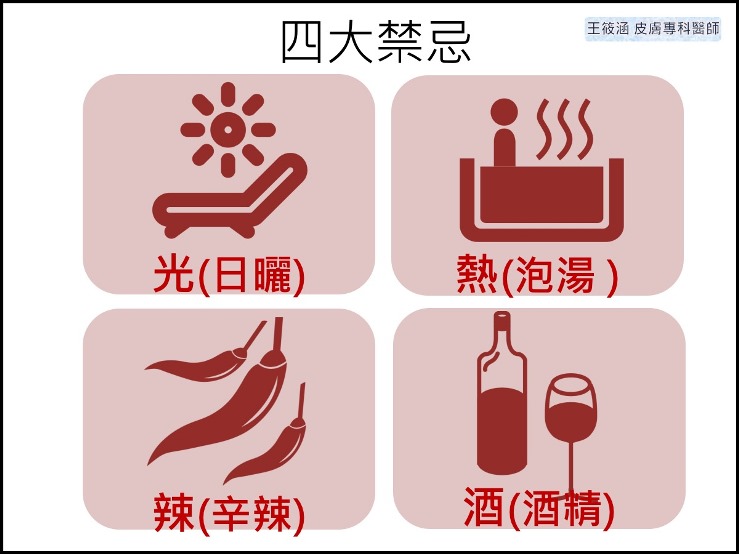 日常保養十分重要,從使用標靶治療的第一天開始,就養成自我保養的好習慣,正確清潔、保濕、防曬以及避開皮膚刺激物,避免日曬、熱水泡澡、辛辣油炸食物和飲酒[5,6]!